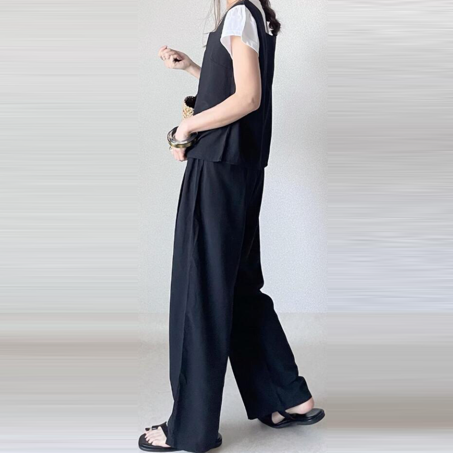 【セット】無地 ノースリーブ タンク ハイウエスト ワイド パンツ 2点セット