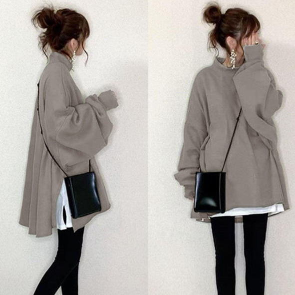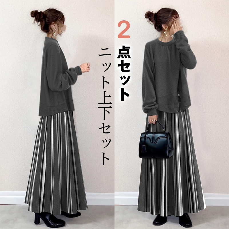 「ランタンスリーブ」ファスナー ラウンドネック 秋冬 ギャザー 配色 無地 ナチュラル 長袖 カジュアルセット