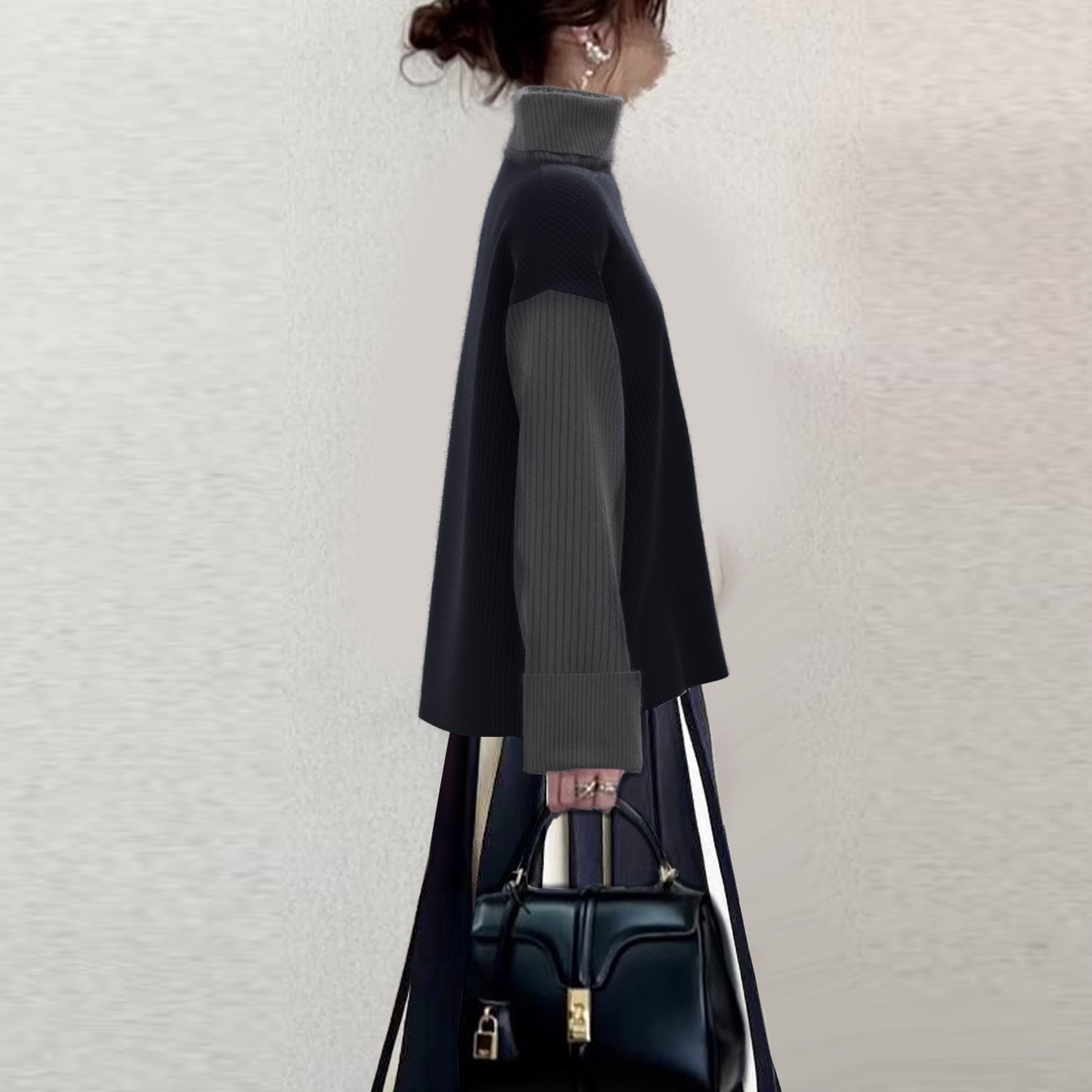 翻折高领落肩长袖撞色针织毛衣+松紧腰撞色针织半身褶裙两件套