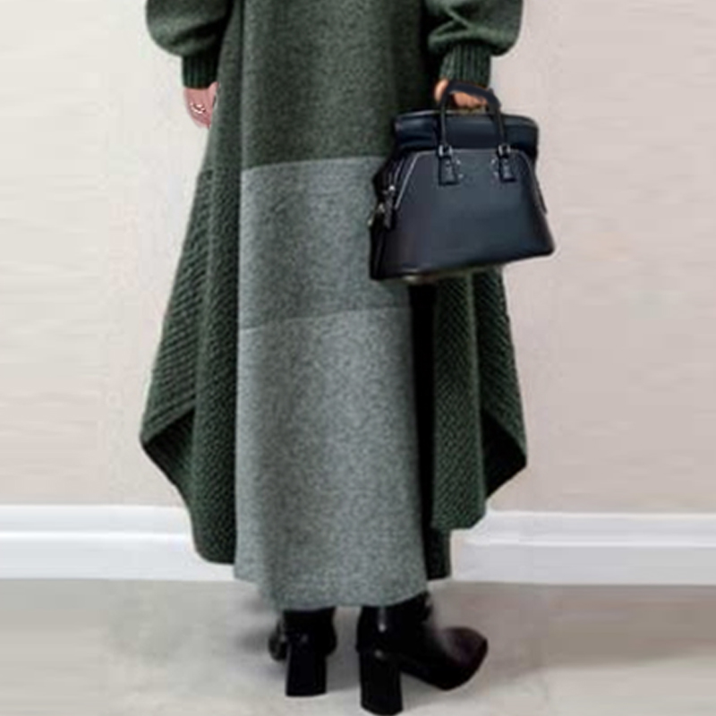 「パフスリーブ」ギャザー ハイネック Aライン 配色 長袖 ニットワンピース