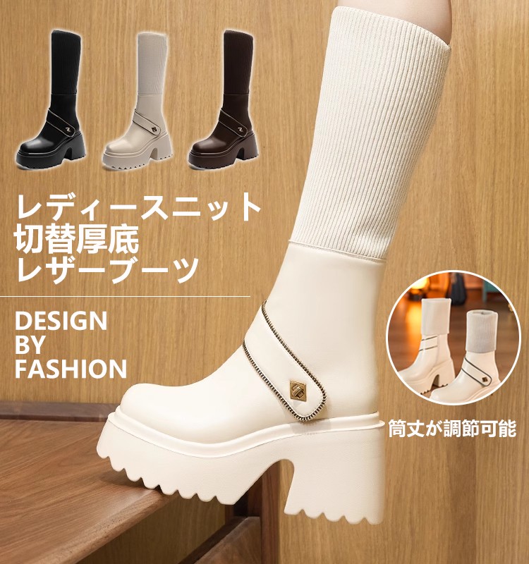 レディースニット切替厚底レザーブーツ