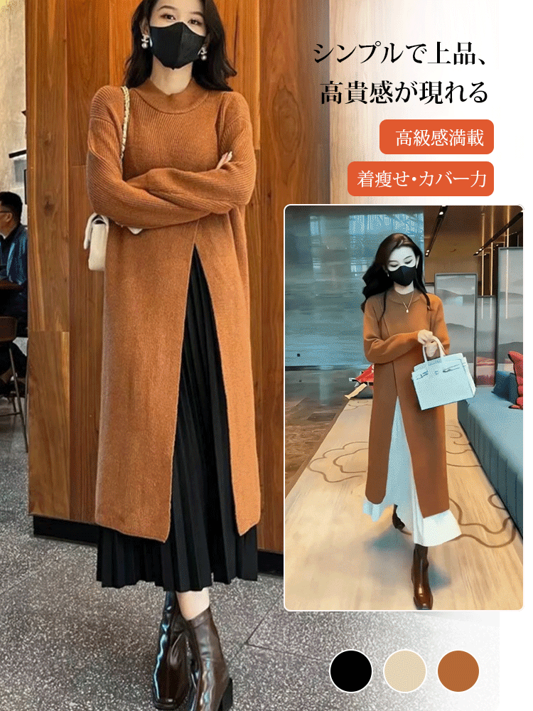 ラウンドネックラインのスプリットニットワンピース